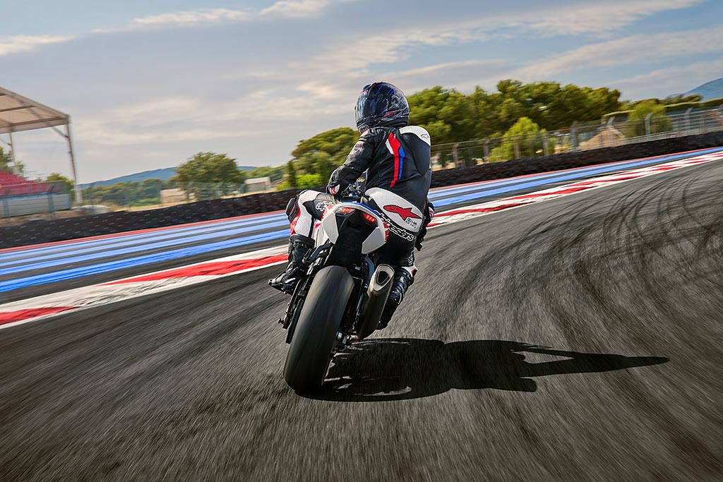 La fourche Öhlins NPX de ø 43 mm et l’amortisseur arrière TTX36 offrent des performances adaptées au circuit, avec des réglages gérés par l’interface utilisateur OBTi (Öhlins Object Based Tuning interface). Les disques de frein avant sont mordus par des étriers radiaux 4 pistons Brembo Stylema secondés par un système antiblocage ABS réglable pour une utilisation sur circuit.