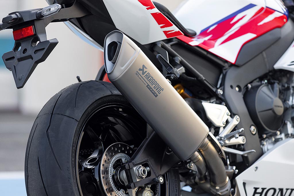 D’autres détails supplémentaires distinguent cette version limitée. Ainsi, à la mise sous tension, l’écran affiche une animation “Ring of Fire” lors du chargement. Un numéro de série unique à chaque moto est gravé au laser sur le té supérieur tandis que les logos du 30e anniversaire – appliqués sur le bouchon du réservoir, le boîtier Smart Key et le silencieux Akrapovič – marquent subtilement cette machine et lui confèrent une place à part dans l’histoire de Honda.