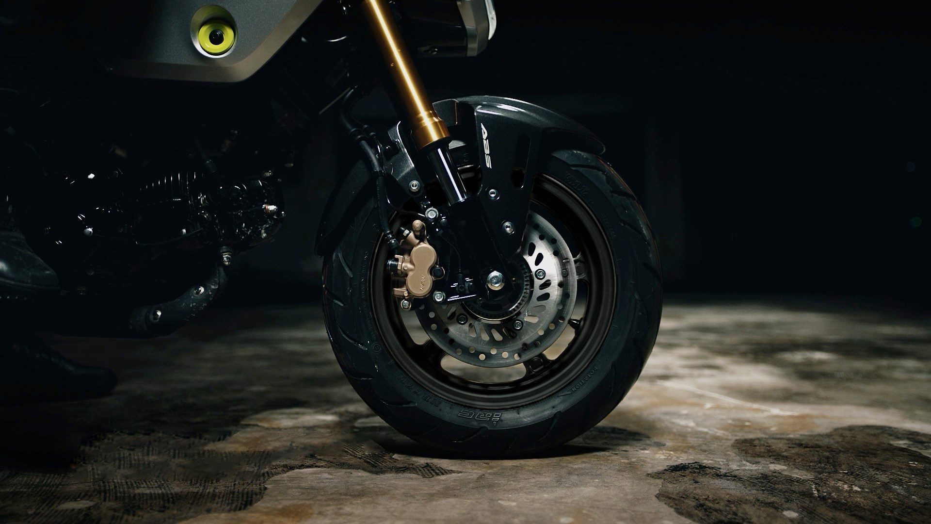 Autre élément fondamental dans la forme mais aussi la fonction, les larges jantes en alliage d’aluminium de 12 pouces de diamètre et 2,5 pouces de largeur présentent des branches en « Y » redessinées pour 2021. Ces jantes accueillent des pneumatiques de 120/70 à l’avant et de 130/70 à l’arrière et participent au dynamisme de l’ensemble, tant en termes de performances que d’image. Au chapitre du freinage, l’avant est confié à un disque de 220 mm de diamètre avec étrier double piston « or » tandis que l’arrière profite d’un disque de 190 mm pincé par un étrier simple piston. L’ensemble est associé à un antiblocage ABS géré par la centrale électronique IMU.