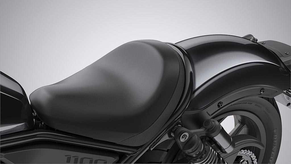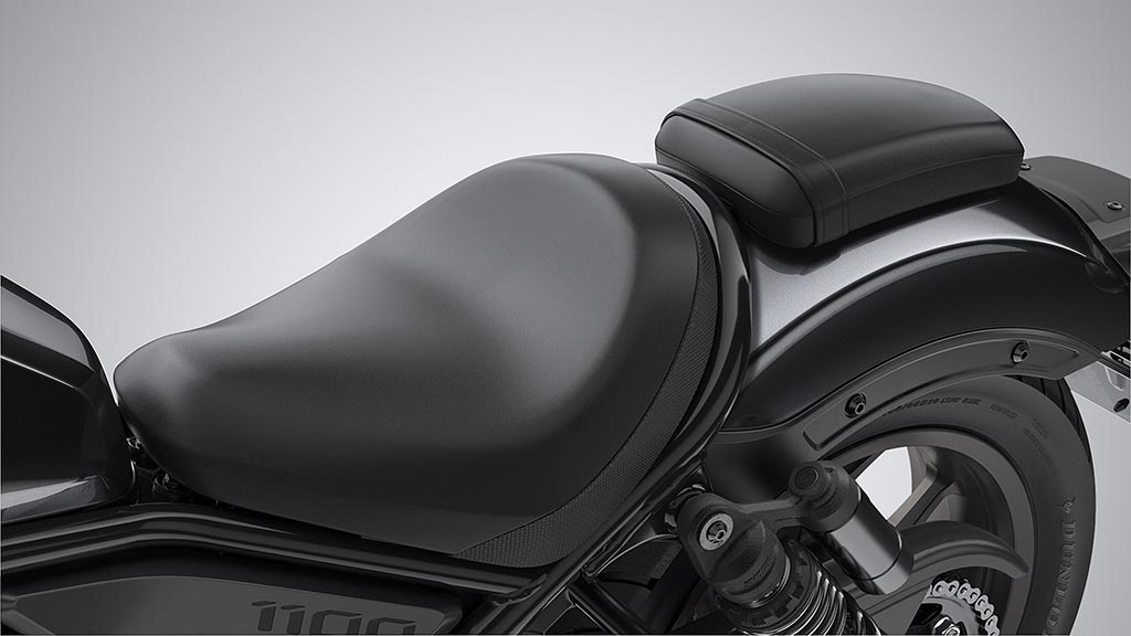 La selle adopte une mousse de moyenne densité afin de privilégier le confort tandis que sa forme a été travaillée de façon à assurer le maintien du pilote lors des fortes accélérations. Comme sa cadette, la CMX1100 Rebel s’apprécie seul ou à deux : la selle passager pouvant être déposée -ou remontée- facilement et rapidement. La partie dédiée au pilote abrite un espace de rangement de 3 l doté d’une prise de charge USB-C.